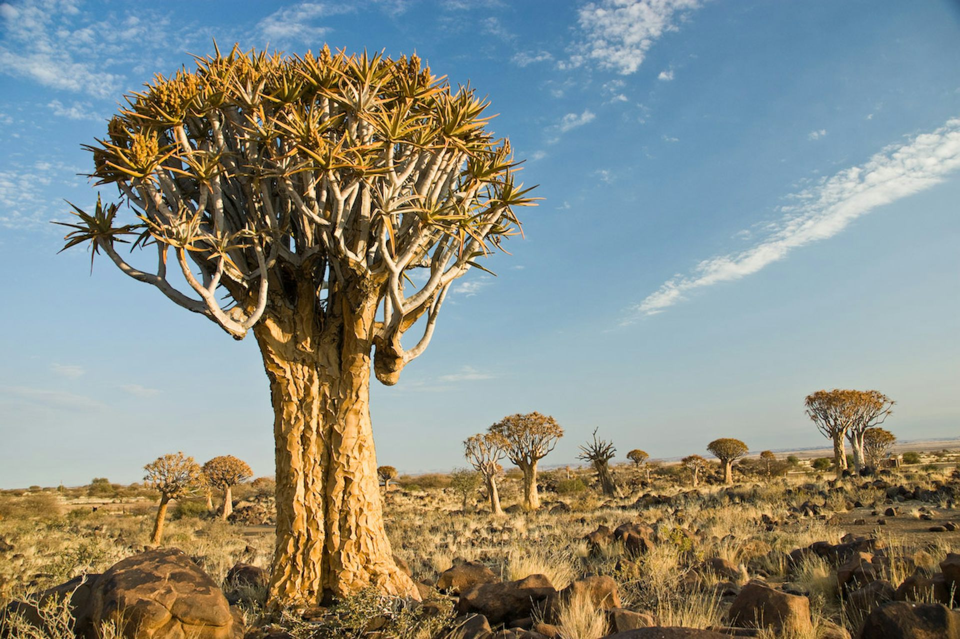 Ещё одна совершенно замечательная точка для туристического созерцания в Намибии — леc деревьев алоэ Quiver Tree Forest, оно же «алоэ дихотома», оно же «колчанное дерево/колчанный лес». Удивительная штука! Как и многое другое в Намибии — совершенно удивительной стране. Так вот, это «алоэ» здесь вырастает в огромные деревья и по интернет-слухам живёт по 200-300 лет (откуда это Интернету известно? ему самому только 30 лет скоро исполнится).